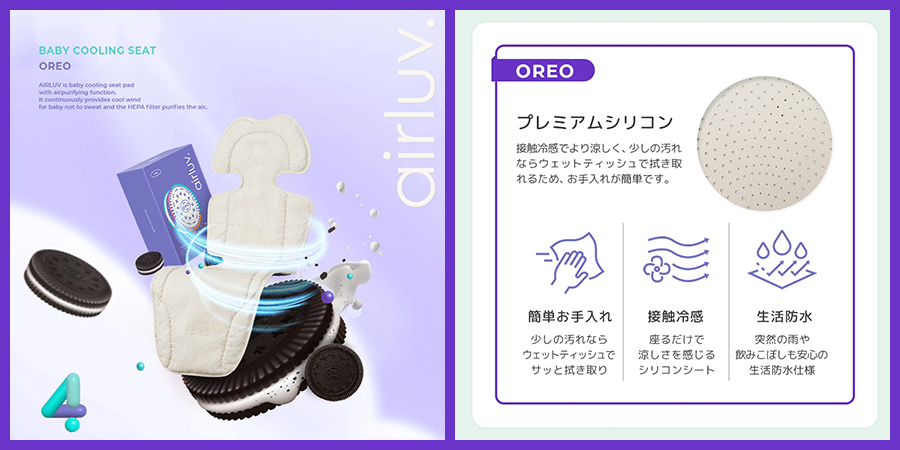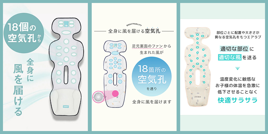 Poled(ポレッド)が販売している「エアラブ」は、ベビーカーやチャイルドシートなどに取り付け、背面から風を送ることでお子様が涼しく過ごせる製品(ベビーシート)です。