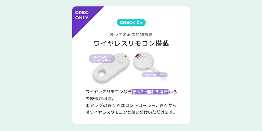 また、2と3はどちらも有線のリモコンですが、4ではオレオのみ無線のリモコンも使用可能です。