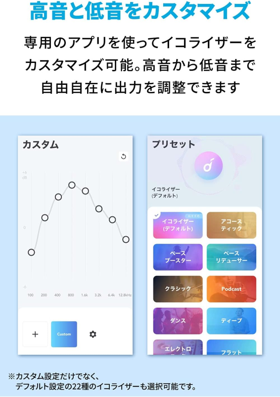 デフォルトの22種類のイコライザーから好みのものを選択できるので、どんなジャンルの音楽も楽しめます。