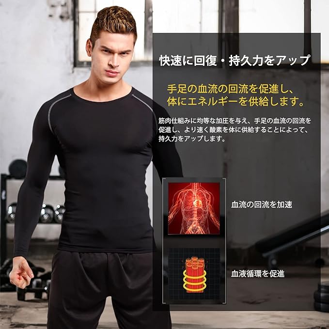 コンプレッションウェアを着ると体に密着した服が程よく体を締め付け、血液の循環を良くして、体の動きをサポートすることが可能です。