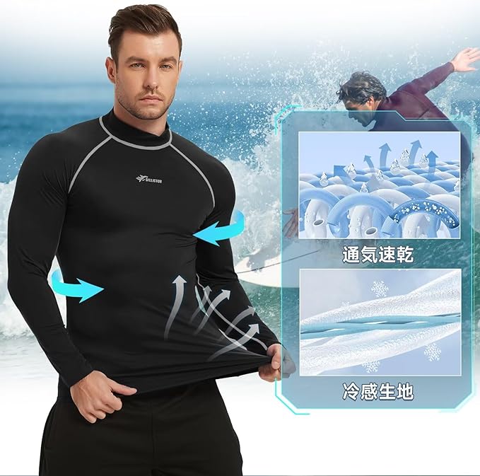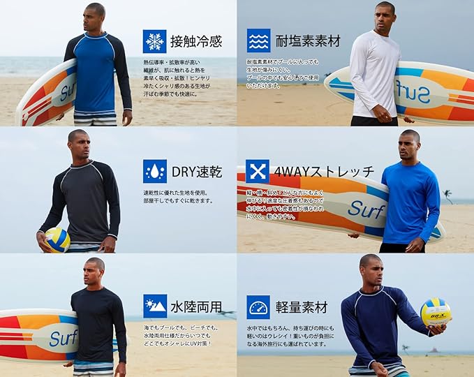 ラッシュガードは元々マリンスポーツ時に着るウエアで、水をあまり吸収せず、吸収しても陸に上がればすぐに乾く速乾性に優れたものが多くなっています。