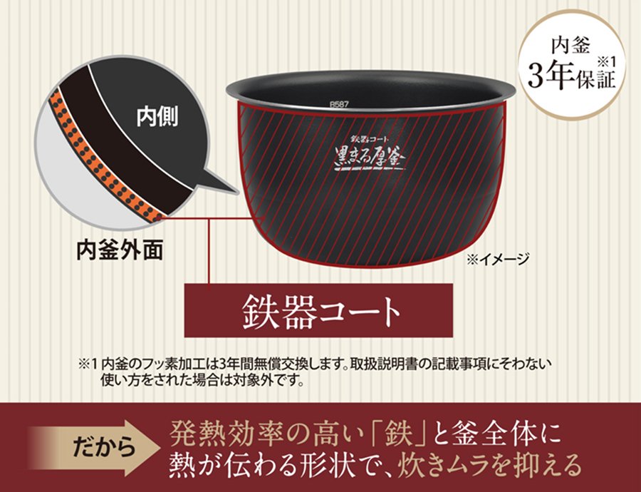 NW-BB18は「黒まる厚釜」に加えて、発熱効率の高い鉄のコーティングがなされています。