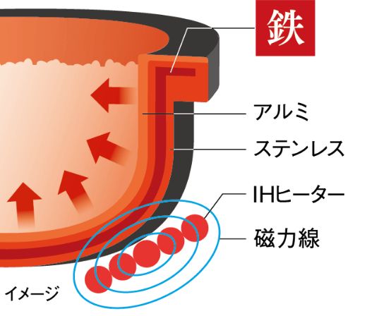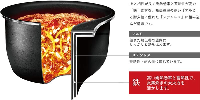「豪炎かまど釜 鉄―くろがね仕込み」は、鉄の素材をアルミとステンレスの素材で包み込み、お米に伝える熱効率を高めた釜です。