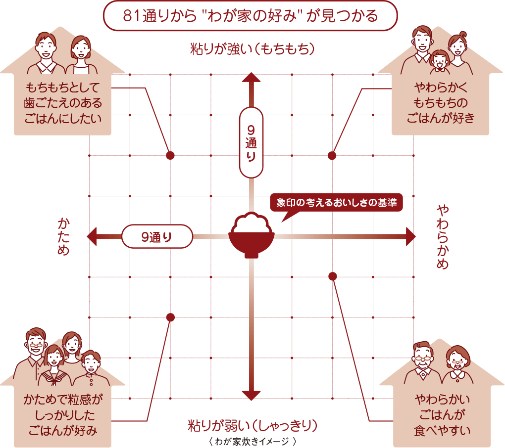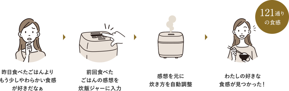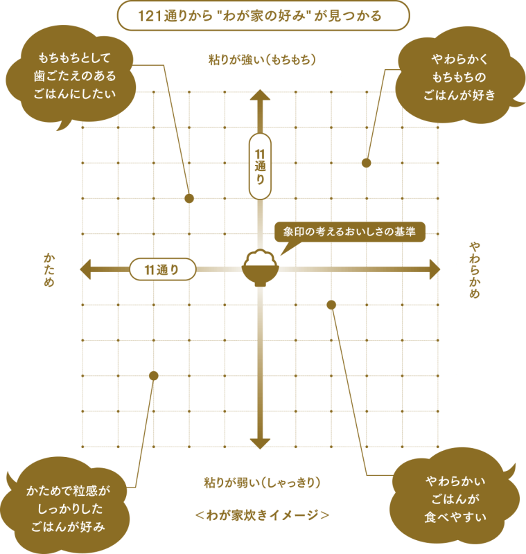 象印は「このお米にはこの炊き方」と決めず、「いまのあなたにはこの炊き方が合いそう」と一緒に好みを探る炊飯器づくりをしています。