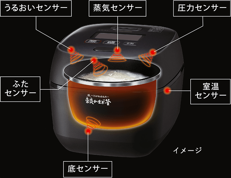 釜底の加熱ポイントを順番に切り替えることで、加熱の偏りを抑え、お米をしっかりかき混ぜながら炊き上げます。