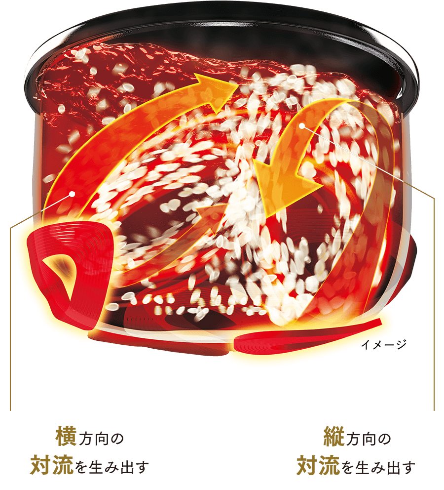複雑で立体的な熱の動きにより、火力がムラなく行き渡り、お米一粒一粒がふっくらと均一に炊き上がります。