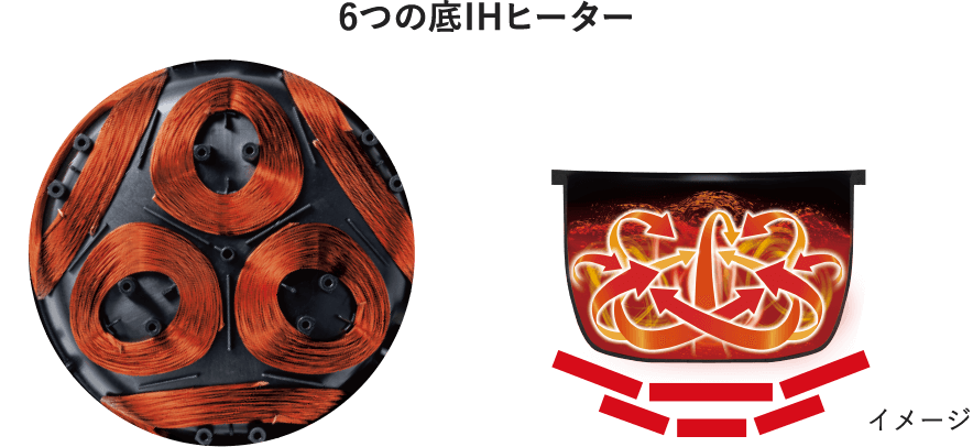 3DローテーションIHは、底IHヒーターの加熱範囲を6つに分け同時加熱することで、縦と横に激しい対流を引き起こし、釜の中心部までかき混ぜながら加熱する方式です。