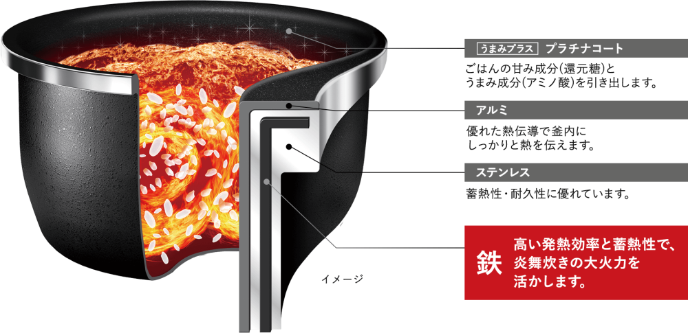 IHと相性が良く発熱効率と蓄熱性が高い「鉄」素材を、熱伝導率の高い「アルミ」と耐久性に優れた「ステンレス」に組み込んだ構造で、大火力を活かすことができ、ごはんがふっくらおいしく炊き上がります。