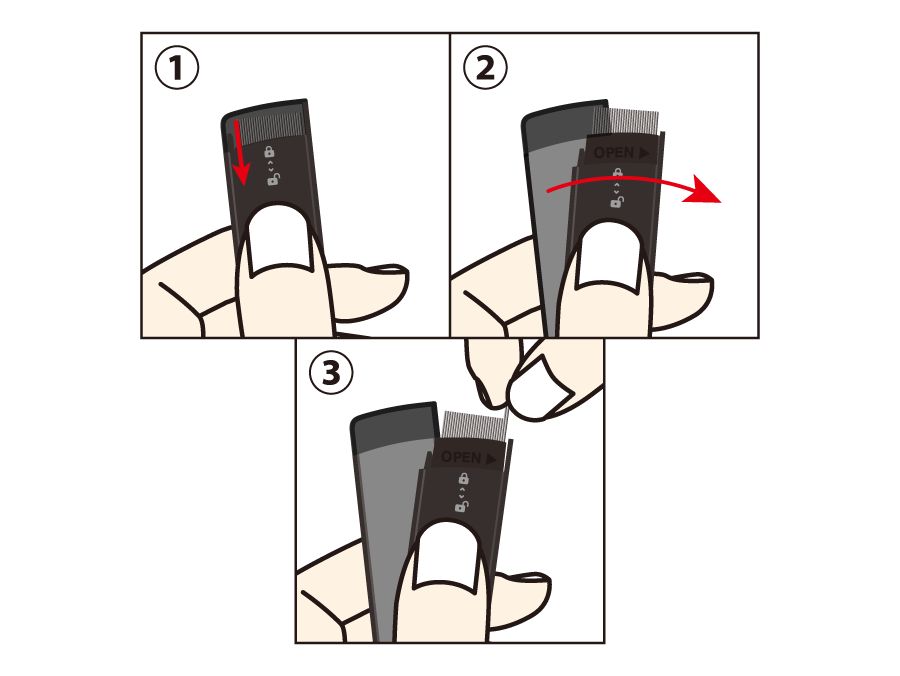 アインは、他の従来品に比べて構造を一新させており、親指で下にスライドさせてロックを解除し、ケースごと横にスライドできます。