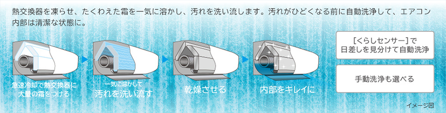 | 凍結洗浄 | 運転時間に応じて作動 | 不在時にも作動 タイマー洗浄可能 室外機にも搭載 |