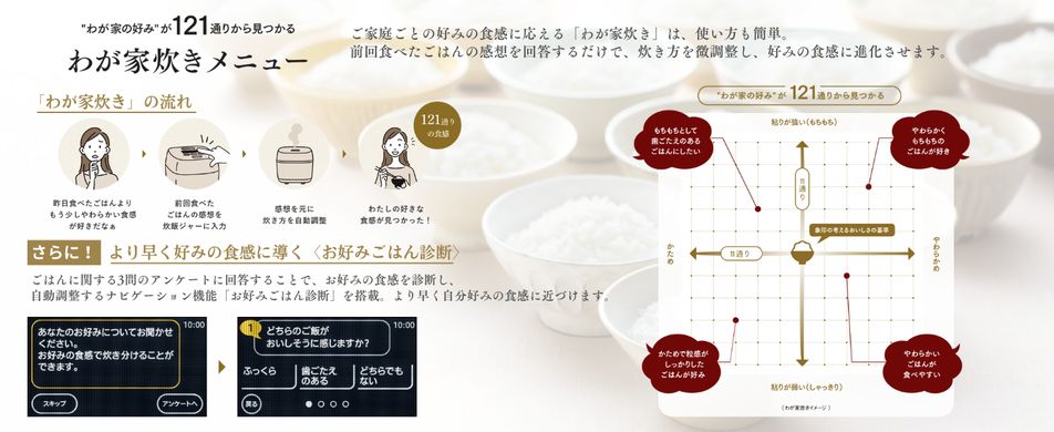 わが家炊きは、ご飯を食べた後に炊飯器にその感想を入力することで、次の炊飯時により好みに近付けることができます。